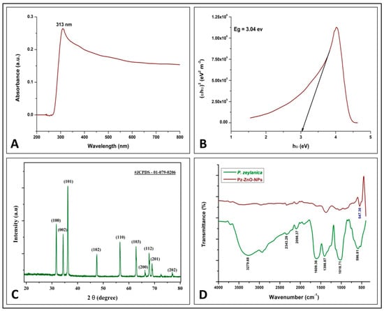 Physico-chemical characterization of Pz-ZnO-NPs. (A) UV absorption spectra; (B) band gap study; (C) powder X-ray diffraction pattern; (D) FT-IR spectra ofPz-ZnO-NPs.