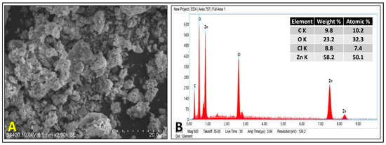 SEM micrograph (A) and EDAX spectra (B) of Pz-ZnO-NPs.