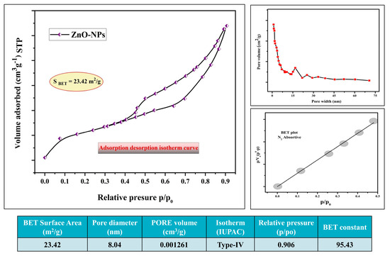 The N2 adsorption and desorption technique was employed to determine the surface characteristics and porosity of the Pz-ZnO-NPs, and Figure 3 illustrates the N2 adsorption/desorption curves. The findings revealed that the Pz-ZnO-NPs exhibited a hysteresis loop of H3, suggesting the presence of a mesoporous structure in the manufactured samples with a specific surface area (SBET) of 23.42 m2 g−1. Likewise, the Pz-ZnO-NPs had a total pore volume of 0.001261 cm3 g−1 (p/po = 0.906), with an 8.04 nm mean pore diameter. The BET/BJH study shed light on the fundamental features of the materials, demonstrating large surface areas, constant pore volumes, and a wide range of pore diameters, which have tremendous promise for catalytic applications [39,40].