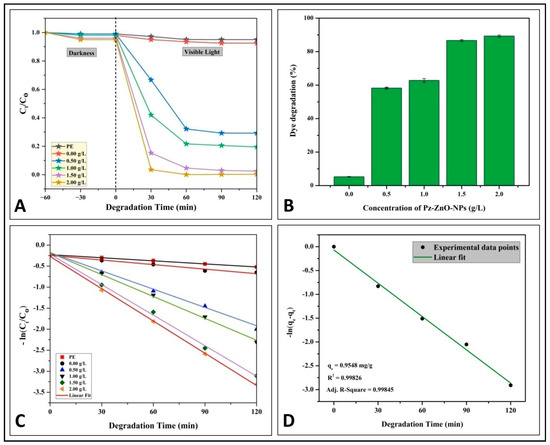 The photocatalytic chemical breakdown of MB dye under an illumination source with varying concentrations of Pz-ZnO-NPs (0–2 g L−1) was examined according to the method of Dhananjay et al. [28]. In brief, an MB dye solution (100 mg L−1) was prepared using distilled water (pH of 7), and known quantities of Pz-ZnO-NPs were introduced and sonicated for 5 min before incubation on a stirrer for 60 min (dark conditions) to achieve adsorption and desorption equilibrium. The incubated flasks holding the reaction mixture were subjected to direct natural sunlight irradiation (~430–790 THz) under continual agitation to ensure uniform mixing. While the intensity of natural sunlight varies, the trials were conducted under similar daytime conditions to ensure reproducibility. Each reaction mixture was collected every 30 min until 2 h of exposure. The obtained mixture from the reaction was instantly centrifuged for 5 min at a speed of 3000 rpm, and the collected supernatant absorbance was noted at 662 nm to quantify the residual quantity of MB dye.