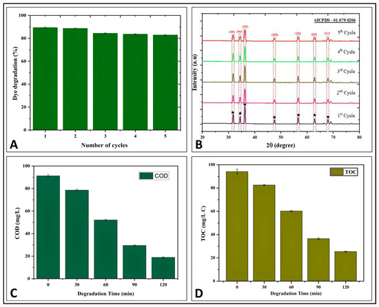 (A) Reusability study up to 5th cycle; (B) structural stability through XRD study; (C) COD study of Pz-ZnO-NPs; (D) TOC study of Pz-ZnO-NPs.