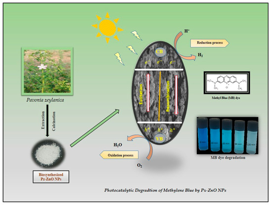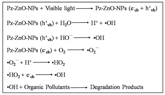 Upon exposure to visible light, Pz-ZnO-NPs absorb photons that possess energy equivalent to or surpassing their inherent bandgap energy, leading to the excitation of electrons from the valence band to the conduction band, thereby engendering the formation of positively charged holes within the valence band [52]. These photogenerated charge carriers, specifically electrons and holes, assume a pivotal role in the generation of reactive oxygen species, which are instrumental in the degradation of organic pollutants. The holes (h+_vb) generated within the valence band instigate the oxidation of water molecules (H2O) or hydroxide ions (OH−) adsorbed onto the catalyst surface, culminating in the production of highly reactive hydroxyl radicals (•OH), renowned for their potent oxidizing capabilities [53]. Concurrently, the excited electrons residing in the conduction band facilitate the reduction of dissolved molecular oxygen, culminating in the formation of superoxide radicals, which subsequently transform into other reactive species, encompassing hydroperoxyl radicals and additional hydroxyl radicals [54]. These ROS attack the dye molecules, breaking them into harmless end products like carbon dioxide (CO2), water (H2O), and other mineral acids. The use of Pz-ZnO-NPs enhances photocatalytic performance by improving light absorption, stabilizing particle dispersion, and facilitating charge carrier separation due to the presence of bioactive phytochemicals. The dye degradation mechanism is described in Figure 6. A schematic illustration of the PD by the biosynthesized catalyst Pz-ZnO-NPs is given in Figure 7. Furthermore, developing and using efficient solar-activated materials is essential when aiming to not leave any contaminants due to environmental contamination.