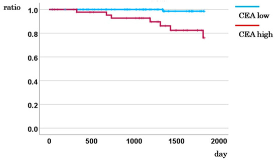 2.4. Prognostic Impact of Preoperative CEA Levels on Disease-Specific Survival