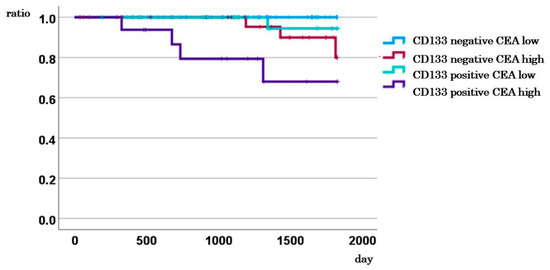 2.6. Impact of Combined CD133 Expression and CEA Levels on DSS in Stage I–III Cases