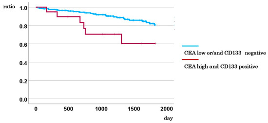 | CD133 and CEA | Others vs. CD133 (positive) and CEA ≧ 5 | 5.948 | 2.210–16.007 | <0.001 |