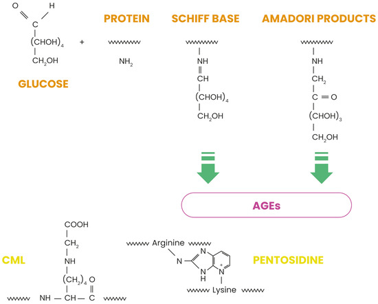 - Twarda-Clapa, A.; Olczak, A.; Białkowska, A.M.; Koziołkiewicz, M. Advanced glycation end-products (AGEs): Formation, chemistry, classification, receptors, and diseases related to AGEs. Cells 2022, 11, 1312. [Google Scholar] [CrossRef]