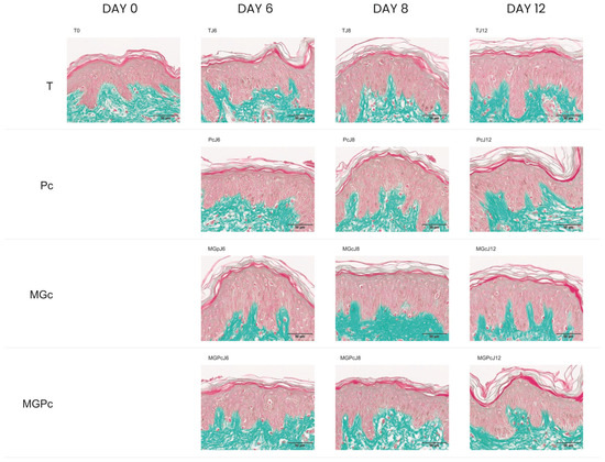 Masson’s trichrome-stained cross-sections of human skin explants. Images represent: baseline sample (T0); untreated control at day 6 (TJ6); Pc-treated sample at day 6 (PcJ6); methylglyoxal-exposed sample at day 6 (MGpJ6); combined Pc and methylglyoxal treatment at day 6 (MGPcJ6); untreated control at day 8 (TJ8); Pc-treated sample at day 8 (PcJ8); methylglyoxal-exposed sample at day 8 (MGcJ8); combined Pc and methylglyoxal treatment at day 8 (MGPcJ8); untreated control at day 12 (TJ12); Pc-treated sample at day 12 (PcJ12); methylglyoxal-exposed sample at day 12 (MGcJ12); and combined Pc and methylglyoxal treatment at day 12 (MGPcJ12). Color identification: epidermal structures—red/pink; dermal collagen fibers—green. Scale 50 µm.