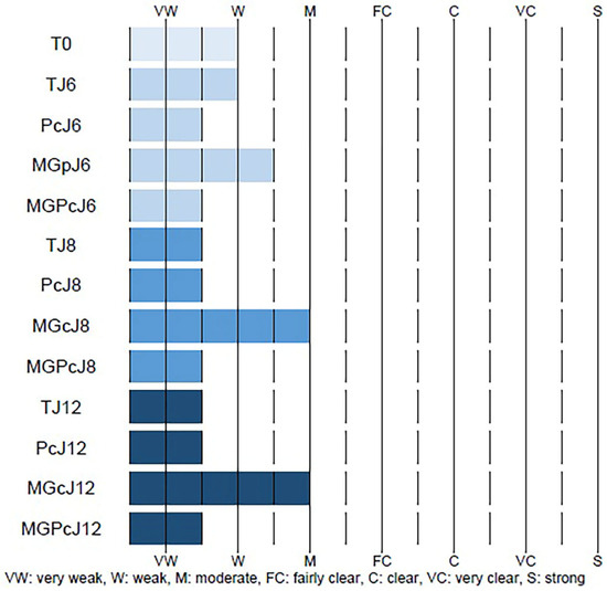Quantitative assessment of CML (Nε-(carboxymethyl)lysine) immunostaining in the dermis (reticular layer) of human skin explants. The data represent the immunostaining intensity under various experimental conditions: Tm (negative control and no antibody); T0 (baseline); TJ6 (untreated control, day 6); PcJ6 (curative product Pc application, day 6); MGpJ6 (methylglyoxal exposure, day 6); MGPcJ6 (combined Pc and methylglyoxal, day 6); TJ8 (untreated control, day 8); PcJ8 (Pc application, day 8); MGcJ8 (methylglyoxal exposure, day 8); MGPcJ8 (combined Pc and methylglyoxal, day 8); TJ12 (untreated control, day 12); PcJ12 (Pc application, day 12); MGcJ12 (methylglyoxal exposure, day 12); and MGPcJ12 (combined Pc and methylglyoxal, day 12). Staining intensity was scored on a scale ranging from VW (very weak) to S (strong), with intermediate values of W (weak), M (moderate), FC (fairly clear), C (clear), and VC (very clear), where dashed lines indicate boundaries between intensity categories and solid blue bars represent the measured intensity range for each sample (TJ6-MGPcJ12).