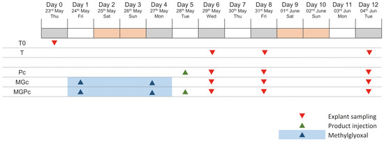 Study design of human skin explant glycation protocol. Red triangles: explant sampling; green triangles: Pc (curative product) injection; blue triangles and shading: methylglyoxal application. T0: baseline; T: untreated control; Pc: curative product group; MGc: methylglyoxal group; MGPc: combined methylglyoxal and curative product group.