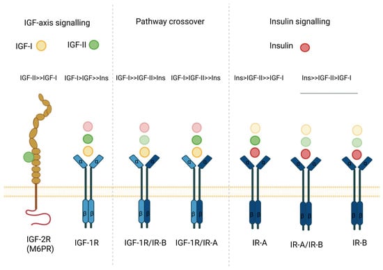 The insulin-like growth factor (IGF)/insulin axis: receptors and ligands. Receptors include transmembrane receptors (the IGF-1 receptor (IGF-1R) and the insulin receptor (IR)), hybrid heterodimers (IR-A and IR-B) and hybrid tetramers (IGF-1R/IR). Hybrid receptors are formed from the heterodimerisation of IGF-1R and IR subunits. Ligands include insulin, IGF-I, IGF-II and their variants (high-molecular-weight IGF-II). IGF-2R/mannose 6-phosphate receptor (M6PR) is a transmembrane glycoprotein without kinase activity. Relative binding affinities for each receptor–ligand interaction differ. Insulin binding affinity is strongest for the IR-A and IR-B homodimers and weaker for heterodimeric receptors. IGF-I binding affinity is strongest for the IGF-1R, IGF-1R/IR-A and IGF-1R/IR-B heterodimers. IGF-II binding affinity is strongest for the IGF-1R, IR-A and IGF/IR-A heterodimeric receptor. Overarching biological effects for receptor activation via these pathways include the modulation of metabolism and mitogenesis. Figure adapted from [,,,]. Created with BioRender.com.