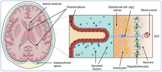 In the adult human brain, one of the major sites for the retention of IGF-II and IGFBP-2 abundance is the ChP []. The ChP is a tissue present in the third, fourth and lateral ventricles of the brain from which CSF is secreted [,]. This structure is highly vascularised and constitutes the blood–CSF barrier to restrict solute flow via epithelial tight junctions [] (Figure 3). CSF provides a rich source of mitogens and growth factors to the brain with a unique biochemistry to that of plasma []. Due to the close spatial proximity of the SVZ to the ChP, adult SVZ NSC processes can contact the CSF via apical primary cilia [,,] (Figure 3). Indeed, it has been shown that pinwheel structures are set up in which ependymal cells surround apical cilia of type B NSCs []. Therefore, the CSF must be considered as an extremely important component of the NSC niche. Notably, CSF blockage or composition changes inhibit the proliferation of neural precursors, inhibit neuronal migration and result in abnormal cortex development [,,].