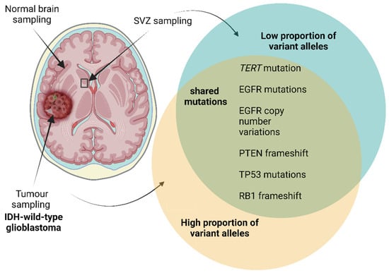 Schematic representing the findings in isocitrate dehydrogenase (IDH)-wildtype temporally located glioblastomas from Lee et al. (2018) []. Samples taken from SVZ free from tumours and the tumour itself were subject to whole-exome sequencing. Matching mutations between the two sites were found including single nucleotide variants in epidermal growth factor receptor (EGFR), tumour protein 53 (TP53) and telomerase reverse transcriptase (TERT). Insertions or deletions in phosphatase and tensin homolog (PTEN) and retinoblastoma protein (RB1) were also detected. The proportion of variant alleles or the variant allele frequency was much lower in SVZ samples than in tumour tissue (TERT C228T mutation SVZ: 1–22%, tumour: 22–52%). The figure is a visualisation of the results presented in []. Created with BioRender.com.