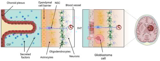 The repeated isolation of well-established CSF-derived morphogens and growth factors including FGF2, EGF, Shh, retinoic acid and Wnt5a in combination with less-well characterised components such as IGFBP-2 and IGF-II underscores the importance the ChP secreted niche [,,,,]. It is not unreasonable to suggest that alterations to the CSF milieu as a result of brain malignancy or injury may be a major source of inflammatory or tumorigenic signals. Indeed, in 2022, it was shown that gliomas in close proximity to the lateral ventricle cause ependymal barrier disruption and increased tumour–CSF contact [] (Figure 5).