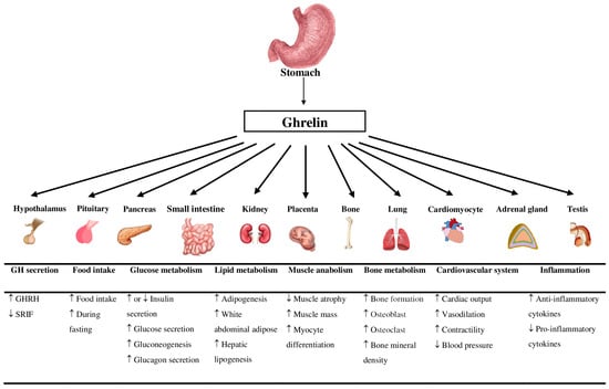 - Akalu, Y.; Molla, M.D.; Dessie, G.; Ayelign, B. Physiological Effect of Ghrelin on Body Systems. Int. J. Endocrinol. 2020, 2020, 1385138. [Google Scholar] [CrossRef]