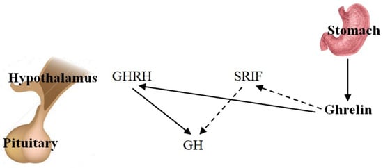 GH is produced and secreted by the somatotrope cells of the anterior pituitary, although it is accepted that other extra pituitary sites produce GH with autocrine or paracrine actions []. At the hypothalamic level, GH secretion is controlled dually by two peptides with opposing roles, GH-releasing hormone (GHRH) and somatotropin release-inhibiting factor (SRIF) [,]. The GH-releasing action of ghrelin takes place both directly on pituitary cells and through modulation of GHRH from the hypothalamus; some functional anti-somatostatin action has also been shown [,,,] (Figure 2).