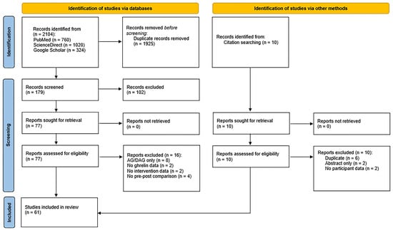 PRISMA 2020 flow diagram for the systematic review, including the identification process, screening, and final number of studies included. AG, acyl-ghrelin, DAG, des-acylghrelin.