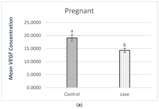 (a). Comparison of VEGF plasma levels in pregnant patients (patients vs. controls), where a, b stand for different superscripts within columns that are significantly different, p < 0.05. (b). Comparison of VEGF plasma levels in non-pregnant patients (patients vs. controls), where a, b stand for different superscripts within columns that are significantly different, p < 0.05.