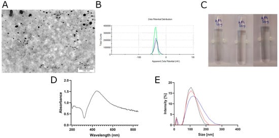 Physiochemical analysis of silver nanoparticles (AgNPs). (A) Morphology of AgNPs visualized by transmission electron microscopy (TEM). (B) Zeta potential distribution of AgNPs. (C) Photographs of the hydrocolloid after 0 h, 24 h, and 48 h. (D) UV–Vis spectrum of AgNPs. (E) Hydrodynamic diameter of AgNPs−size distribution.