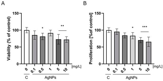 Analysis of silver nanoparticle (AgNP) toxicity. (A) The viability of HUVECs after a 24 h incubation on nanoplatforms composed of a Geltrex ECM and AgNPs at concentrations ranging from 0.1 to 10 mg/L. (B) The proliferation of HUVECs after 48 h of incubation on the same nanoplatforms. The results are presented as a percentage of the control group ± standard deviation. Asterisks above the bars indicate statistically significant differences compared to the control (* p < 0.05; ** p ≤ 0.01; *** p < 0.001).
