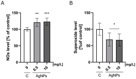 Nitric oxide and mitochondrial superoxide synthesis levels. (A) Nitric oxide and (B) mitochondrial superoxide levels in HUVECs after 24 h of incubation on nanoplatforms composed of Geltrex ECM and AgNPs at concentrations of 0.5 mg/L and 10 mg/L. The results are presented as a percentage of the control ± standard deviation. Asterisks above the bars indicate statistically significant differences compared to the control (* p < 0.05; ** p ≤ 0.01; *** p < 0.001).
