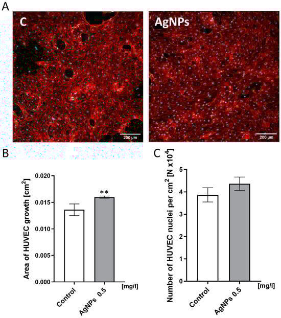 HUVEC monolayer formation. (A) Confocal images of HUVECs cultured on control Geltrex ECM (“C”) and ECM supplemented with AgNPs at 0.5 mg/L (“AgNPs”). The Geltrex ECM enriched with a low concentration of AgNPs increased the cell coverage and promoted monolayer formation. (B) The quantitative analysis of the cell-covered growth area. (C) The quantification of the number of cell nuclei per cm2. The nuclei were stained with Hoechst 33,342 (cyan color), and the actin cytoskeleton was labeled with Atto 633-conjugated phalloidin (red color). Measurements were performed using ImageJ software (version 1.54p). The results are presented as mean ± standard deviation. Asterisks above the bars indicate statistically significant differences between control and experimental groups (** p ≤ 0.01).