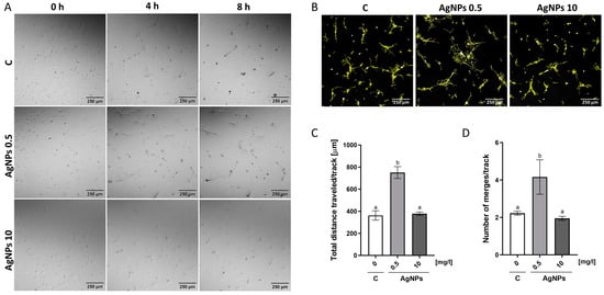 Cell migration was evaluated using time-lapse cell tracking. HUVECs were stained with Hoechst 33,342 (0.5 μg/mL, 10 min, room temperature) and seeded at 1 × 104 cells per dish in a growth medium on ECM-coated, glass-bottom dishes (Eppendorf, Hamburg, Germany) containing AgNPs at 0.5 and 10 mg/L or without nanoparticles (control).