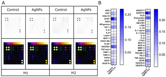 Proteins involved in angiogenesis expressed after 24 h incubation of HUVECs on nanoplatforms made of Geltrex ECM (control) and ECM with AgNPs at concentration of 0.5 mg/L, determined by human angiogenesis antibody array membranes. The results were normalized to the control groups for M1 and M2. Images were created with ImageJ software (A). Mean chemiluminescence value for each protein (B).