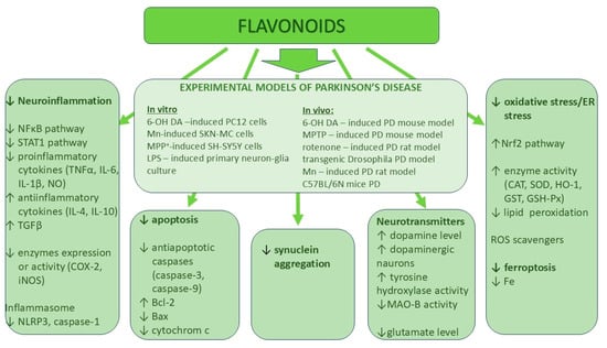 Parkinson’s disease (PD) is a complex, age-related, and the most common neurodegenerative movement disorder associated with dopamine deficiency and both motor and nonmotor deficits. Various environmental, cellular, and genetic factors increase PD risk, leading to mitochondrial dysfunction, oxidative stress, protein aggregation (e.g., of α-synuclein), impaired autophagy, impaired neurotransmitter metabolism (e.g., of dopamine in substantia nigra), and neuroinflammation. Recent studies, such as epidemiological studies, indicate that neuroinflammation is not only a response to the ongoing neurodegeneration but may be an essential upstream contributor to α-synuclein aggregation and neurodegeneration progression. Interestingly, peripheral inflammatory processes (e.g., type 2 diabetes, high cholesterol levels, and inflammatory bowel disease) elevate PD risk [2]. Parkinson’s disease treatment is mainly symptomatic and often accompanied by serious side effects. Therefore, naturally occurring agents, including flavonoids, which reduce oxidative stress and neuroinflammation without side effects, may be helpful in the protection and treatment of Parkinson’s disease [3].