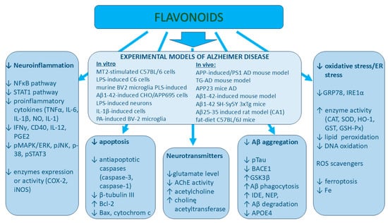 The inhibitory effects of diosmetin on APP metabolism and Aβ generation were examined in another study performed on SH-SY5Y cells (a well-characterized cellular model of AD). Diabetes may be a risk factor for AD development. Hyperglycemia facilitates the glycosylation of proteins, with glucose residues resulting in the formation of advanced glycation end products (AGEs). Furthermore, AGEs activate a cascade comprising the production of reactive oxygen species and the stimulation of APP processing pathways, finally resulting in Aβ production. The aggregated Aβ results in ER stress, which initiates a multistep cascade, leading to neuronal death and dementia [42]. It was demonstrated that AGE-induced APP degradation and the increased production of Aβ were reversed by the presence of diosmetin in SH-SY5Y cells. The mechanism of action of diosmetin involved the inhibition of ER sensitivity to AGEs by the reduction in ROS generation. It was observed that diosmetin reversed the AGE-induced inhibition of anti-oxidative enzyme activity (SOD, CAT, GSH-Px), resulting in lowered ROS level, ER stress, and ER stress-mediated apoptosis. Diosmetin inhibited the next step of Aβ generation by decreasing the level of β-secretase-1, an enzyme that initiates APP processing. Finally, it was demonstrated that diosmetin enhanced the protein levels of two proteases, insulin-degrading enzyme (IDE) and NEP, involved in Aβ degradation. In this way, diosmetin protects against Aβ deposition [42].