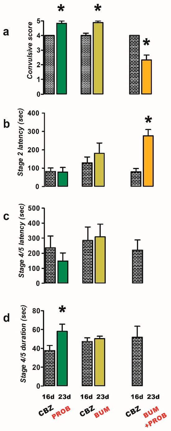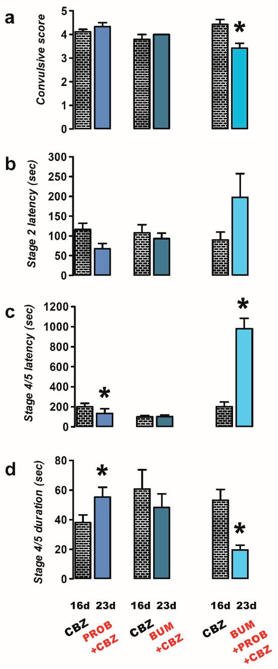 - Probenecid group (n = 6): one week after the last administration of CBZ (day 23), rats were administered probenecid (50 mg/kg i.p.) 50 min prior to stimulation with PTZ;