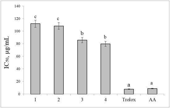 DPPH radical-scavenging activity of the extracts. IC50, μg/mL: the antioxidant concentration that causes 50% DPPH loss in the assay of DPPH radical-scavenging activity. Different letters indicate significant differences in this parameter (p ≤ 0.05) according to Tukey’s HSD test. Definitions: 1: the above-ground parts of A. cimicifuga; 2: the underground part of A. cimicifuga; 3: the above-ground parts of A. erythrocarpa; 4: the underground part of A. erythrocarpa; AA: ascorbic acid.