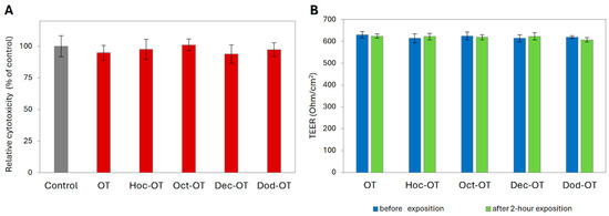 Before permeability experiments, the cytotoxicity and the effect of OT and its derivatives (Oct-OT, Hoc-OT, Dec-OT, Dod-OT) on Caco-2 intestinal barrier integrity were examined. This assessment was performed using a dose (100 µg/mL) and treatment time (2 h) similar to those applied in the intestinal transport analysis. No cytotoxicity of the tested compounds at a concentration of 100 µg/mL after a 2 h exposure was observed (Figure 1A). Moreover, the TEER values measured in Caco-2 cell models before and after treatment with OT and its analogs indicated stable and high monolayer integrity (Figure 1B).