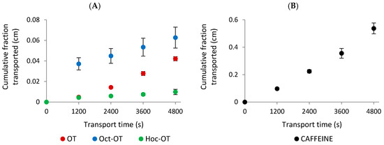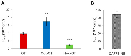 In this study, the caffeine permeability test was performed to confirm the suitability of the Caco-2 cell model to determine transepithelial transport. Caffeine is recognized as a reference substance for which high permeability has been documented [44,45]. The results obtained from transport studies confirmed the high intestinal caffeine permeability with Papp value 111.10 ± 9.89 × 10−6 cm/s (Figure 2B and Figure 3B), which proves Caco-2 monolayer functionality and its suitability to evaluate the intestinal transepithelial transport of OT derivatives.
