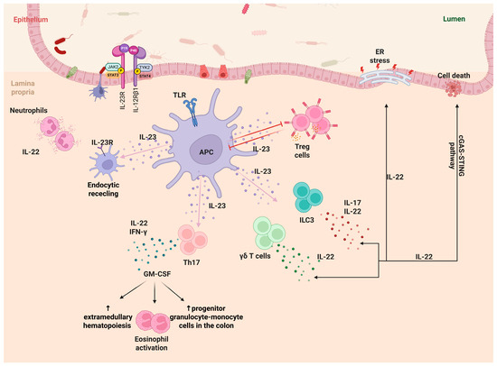 In addition to ILC3s, IL-22 is produced by Th17 cells, neutrophilic granulocytes, and γδ T cells in response to IL-23 [62]. Its role in intestinal inflammation is both protective and harmful. On one hand, the lack of IL-22 exacerbates colitis and T cell-mediated colitis in adoptive transfer models, and is necessary for optimal host defense against pathogens [63,64]. On the other hand, IL-22 worsens intestinal inflammation by enhancing endoplasm reticulum (ER) stress in epithelial cells [65,66]. IL-22 inactivation in IBD mouse models significantly reduced colitis levels, correlating with diminished ER stress in the intestinal epithelium [65]. Moreover, IL-22 promotes excessive activation of the cGAS-STING pathway in intestinal mucosa in the absence of the ATG16L1 gene (linked to CD susceptibility), resulting in cell death [66].