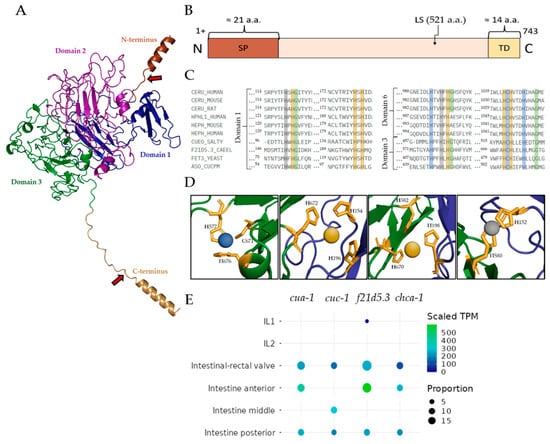 (A) Putative spatial model of F21D5.3, including a C-terminal GPI-anchor addition site (predicted using D-I-TASSER URL: https://zhanggroup.org/, accessed on: 13 January 2025); plastocyanin-like domains are colored blue, magenta and green. (B) Domain arrangement of F21D5.3. The N-terminal domain is depicted in red, the C-terminal transmembrane domain is depicted in yellow, and the mature protein is depicted in pink; LS—labile site. (C) Alignment of plastocyanin-like domains of MCOs from different phylogenetic groups (trivial species names, gene names, and sources of amino acid sequences are provided in Table S2). (D) Structures of the respective copper-binding centers in the predicted structure. The mandatory MCO copper-binding residues are shown, and putative positions of copper ions are indicated. The colors of residues in section C and copper ions in section D correspond, in addition to copper center types (blue for type 1 Cu, grey for type 2, yellow for type 3). Color of the polypeptide chain in section C is the same as in section A. (E) Heat map of F21D5.3 gene expression in C. elegans and expression of genes involved in copper transport to the Golgi complex lumen, homologous to the mammalian Cp metallation axis.