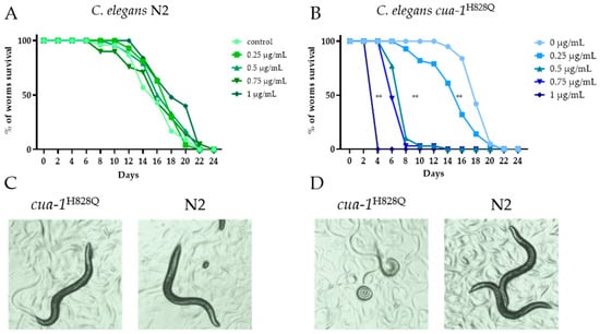Initially, a concentration of AgNPs below that causing toxicity but sufficient to observe the effect of Ag+ was determined. For this purpose, a lifespan test was performed. The results, presented in Figure 2, show that the sensitivity threshold of cua-1H828Q nematodes to AgNPs is much lower than that of wild-type nematodes (Figure 2A,B).