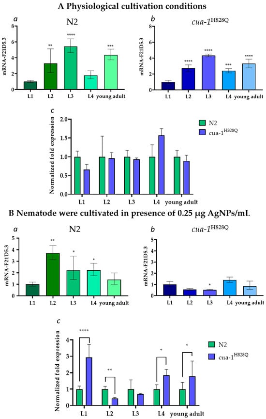Changes in the content of mature transcription products of the F21D5.3 gene during the nematode life cycle under (A) physiological conditions and (B) in the presence of 0.25 μg/mL AgNPs. L1–L4: larval stages of the nematode; y.ad: young adult stage. Y-axis: concentration of F21D5.3 mRNA, a.u. (a,b)—F21D5.3 gene expression in N2 and cua-1H828Q strains under physiological conditions or in presence AgNPs, respectively; (c) normalized expression level of the F21D5.3 gene in N2 and cua-1H828Q strains. The data were subjected to one-way ANOVA followed by Tukey’s post hoc test: (*)—p-value < 0.05; (**)—p-value < 0.01; (***)—p-value < 0.001; (****)—p-value < 0.0001).