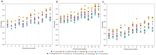 Gene loss rates in Oryza plants, with L. perrieri as the reference. The horizontal coordinate represents the 12 chromosomes of the Oryza plant, and the vertical coordinate represents the loss rates. The loss rates of 12 chromosomes of each species in the figure are represented by different colored dots. Note: (a) The loss rates of 12 chromosomes of each species. (b) The loss rates of 12 chromosomes of subgenome 1. (c) The loss rates of 12 chromosomes of subgenome 2.