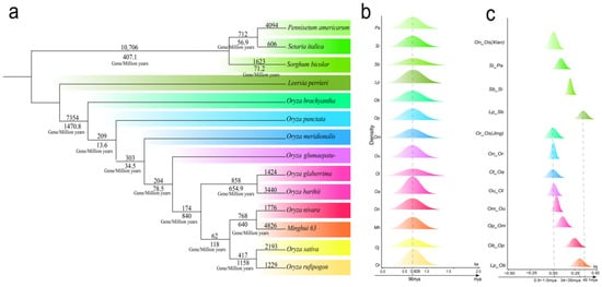 The genomic data of ten Oryza species and four other species, including Oryza sativa ssp. Jing (indica) [], Oryza glaberrima [], Oryza brachyantha [], Oryza rufipogon [], Oryza nivara [], Oryza glumaepatula [], Oryza meridionalis [], Oryza barthii [], Oryza punctata [], Setaria italica [], Sorghum bicolor [], and Leersia perrieri [], were downloaded from the Gramene database (https://www.gramene.org (accessed on 2 October 2023)). Oryza sativa ssp. Xian (Japonica) (Minghui 63, a Xian rice) [] was downloaded from the NCBI (National Center for Biotechnology Information). Pennisetum americarum [] was downloaded from the Icrisat database (https://cegresources.icrisat.org/ (accessed on 2 October 2023)) (Supplementary Table S7).