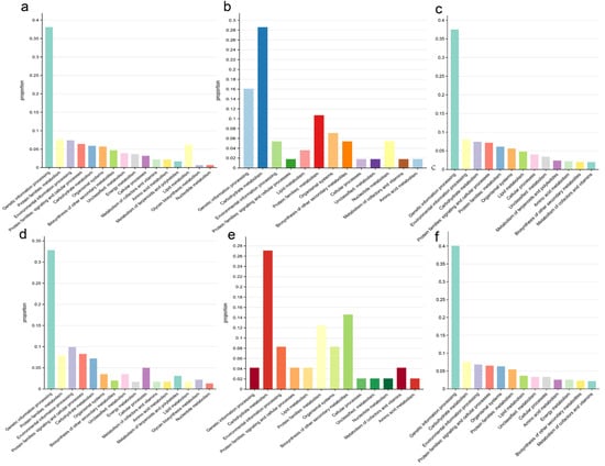 KEGG enrichment analysis was used to explore the functions of genes or proteins by mapping them to known biological pathways to reveal their potential roles []. This helped elucidate the functional relationships of genes and the molecular mechanisms underlying biological processes. We performed KEGG enrichment analysis for homologous genes lost in O. sativa (Jing rice) and O. rufipogon (Figure 4c,f). Most of the lost genes in O. sativa (Jing rice) were related to genetic information processing, with 627 genes accounting for 37.52% of the total. Similarly, in O. rufipogon, 610 lost genes were related to genetic information processing, accounting for 40.08% of the total. In Jing rice, 134 lost genes (8.02%) were associated with environmental information processing, while in O. rufipogon, 104 lost genes (6.83%) were classified into this category.