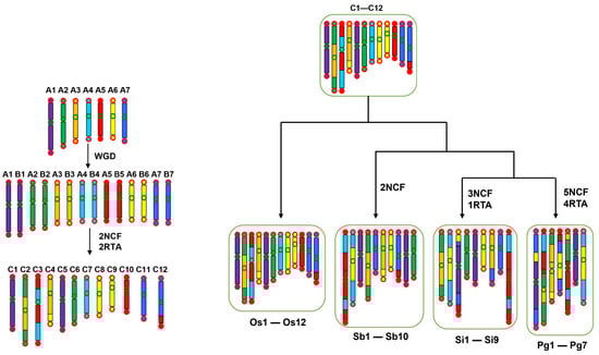 Evolutionary trajectory of grass chromosomes. The process of evolution from the ancestral chromosomes of grasses to those of rice, sorghum, foxtail millet, and pearl millet was reconstructed. Before the GCT, seven ancestral chromosomes (in different colors) were inferred. The duplicated chromosomes during the GCT were then reduced to 12 due to chromosome fusions and DNA exchanges, whose major structures have been well preserved in Oryza plants. The 12 chromosomes were then reduced in each plant under study. Os, Sb, Si, and Pg stand for O. sativa, S. bicolor, S. italica, and P. americarum.