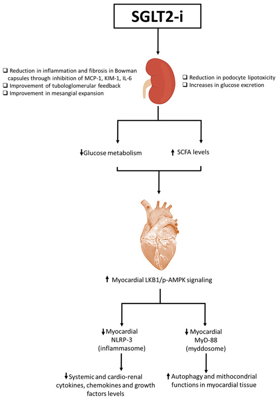 Overall illustration of SGLT2i-related cardiorenal benefits. SGLT2is increase glucose urinary excretion, improve tubule-glomerular feedback and mesangial expansion. Moreover, SGLT2is are able to reduce podocyte lipotoxicity through the inhibition of mTORC-1 pathways in podocytes and reduce inflammation and fibrosis in Bowman capsule through the inhibition of MCP-1, KIM-1, and IL-6. Beneficial renal properties reduce glucose metabolism and increase small chain fatty acid (SCFA) levels systemically and in myocardial tissue. The SCFA metabolism increases LKB-1/pAMPK signaling in myocardial cells that reduces NLRP-3 and MyD-88 pathways. The inhibition of NLP-3 and MyD88 reduces NF-kB/pro-inflammatory cytokine and chemokine pathways, resulting in autophagy and an improvement of mitochondrial functions in myocardial tissue. ⬆: increase; ⬇: decrease.