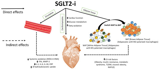 SGLT2is exert direct and indirect cardiac benefits, resulting in enhanced ejection fraction and mitochondrial viability of cardiomyocytes. SGLT2is reduce systemic levels of several cytokines, including IL-1α, IL-1β, IL-2, IL-4, IL-6, IL17-α, IFN-γ, TNF-α, G-CSF, and GM-CSF levels and hs-CRP, and reduce plasma levels of MDA and 4-HNA (lipid peroxidation products), free fatty acids, and MMP-3 levels, improving cardiac health. Moreover, SGLT2is reduce white adipose tissue content and increase brown adipose tissue, rich in M2-polarized macrophages with an-ti-inflammatory properties and anti-obesogenic activity. Switching WAT to BAT induced by SGLT2is reduces several cardiovascular risk factors, including obesity, metabolic syndrome, in-sulin resistance, type-2 diabetes mellitus (T2DM), visceral obesity, and non-alcoholic fatty liver disease (NAFLD).