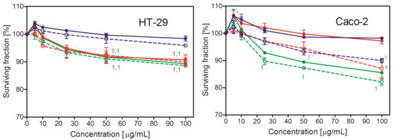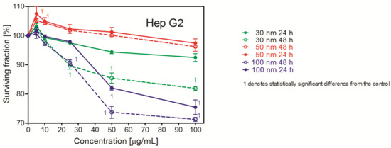 The toxicity of the studied PS NPs was measured by NRU. As shown in Figure 1, the studied NPs were of a low toxicity or non-toxic at all; the reduction of the cell numbers was typically less than 15% of control 48 h after treatment. The most vulnerable were the Hep G2 cells; in this case, the number of living cells was reduced to approximately 75% of control after 24 and 48 h. Interestingly, unlike the other two cell lines, these cells were the most vulnerable to the 100 nm PS NPs. These NPs were prepared in the presence of an anionic surfactant—which might be responsible for the observed effect. Apparently, the Hep G2 cells were the most vulnerable to its action. For the smaller NPs (30 nm and 50 nm) in all cell lines, the number of living cells treated with the lowest concentration of PS NPs (5 μg/mL) was higher than in the control, which suggests the stimulation of cell growth (2–10% after 24 h and 2–7% after 48 h). However, the effect was significant only in the Hep G2 cells. In general, the smallest NPs (30 nm) were more toxic than the larger ones. The two-way ANOVA analysis revealed that the size of NPs was the only factor that affected PS NP toxicity. The investigated cells slightly varied in sensitivity to PS NPs. The Hep G2 cells were the most sensitive, whereas the HT-29 cells were the least sensitive ones.