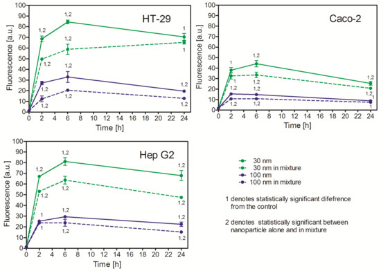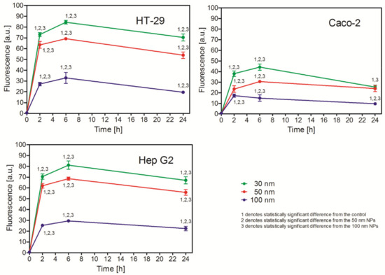 2.3. Uptake of PS NPs of Different Size by HT-29, Caco-2, and Hep G2 Cells