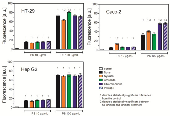 To evaluate the role of a particular internalization mechanism in PS NP uptake, we used different uptake inhibitors. Amiloride, an inhibitor of micropinocytosis, did not affect PS NP uptake in any studied cell line. Nystatin, an inhibitor of caveolin/lipid rafts-dependent internalization, decreased PS NP uptake in HT-29 cells, but to a relatively low extent (87% of the uptake of untreated cells when a higher concentration (100 μg/mL) of PS NPs was used). In contrast, Nystatin markedly increased the uptake of the PS NPs in Caco-2 cells (258% of the uptake of untreated cells when a lower (10 μg/mL) concentration of PS NPs was used). The same effect was observed also for the higher concentration of PS NPs, but to a lower extent (123%). In this cell line, chlorpromazine and Pitstop2, both inhibitors of clathrin-mediated endocytosis (CME) and clathrin-independent, dynamin-dependent endocytosis (FEME), also enhanced PS NP internalization. The effect was appreciable and occurred at both PS NP concentrations (174% and 175% of the uptake of untreated cells for chlorpromazine and Pitstop2 for a 100 μg/mL PS NP concentration, respectively). In contrast, neither chlorpromazine nor Pitstop2 affected PS NP uptake in the HT-29 cells or the Hep G2 cells (Figure 4, Table 4).