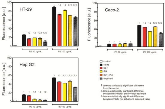 To further investigate the role of different internalization mechanisms in PS NP uptake, we analyzed the effect of scavenger receptor inhibitors. Since the major differences between the studied cell lines in the mRNA expression of the receptors was between SR-A1 and SR-B1 receptors, we decided to inhibit either of the receptors or both simultaneously (Table 5). Polyinosinic acid, an inhibitor of MSR1 (SR-A1) receptor, inhibited PS NP uptake in all investigated cell lines. The effect was highly pronounced at both tested PS NP concentrations, with the exception of the Caco-2 cells, where the inhibition occurred only in the higher PS NP concentration (92%, 73%, and 78% of the uptake of control cells for the higher PS NP concentration for the HT-29MTX, Caco-2, and Hep G2 cells, respectively). BLT-1, an inhibitor of the SCARB1 (SR-B1) receptor, strongly inhibited the uptake of PS NPs in the HT-29MTX cells at both PS NP concentrations (66% and 81% of the uptake of untreated cells for 10 μg/mL and 100 μg/mL, respectively). The effect was also observed in the Hep G2 cells, but to a lesser extent and only at a the higher NP concentration (89% of the uptake of untreated cells). In the Caco-2 cells, the inhibition of SCARB1 had no effect on PS NP uptake (Figure 5, Table 4).