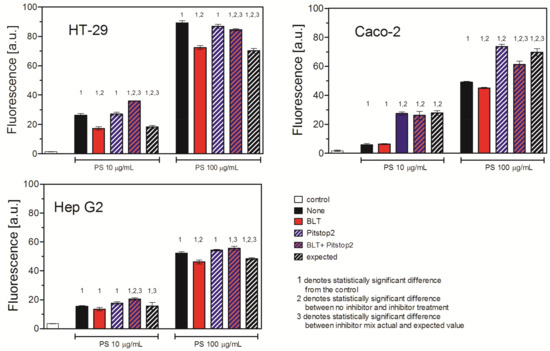 The effects of all inhibitors and their mixtures on the uptake of PS NPs in all three cell lines are graphically summarized in Table 4.