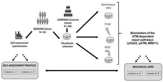 Some symptoms observed in EHS patients like skin rashes may have been also observed in some patients showing cellular and clinical radiosensitivity [38]. Since both cellular and clinical radiosensitivity have been shown to be linked to impaired DNA double-strand breaks (DSB) pathways dependent on the ATM kinase protein, a major actor of the stress response [39,40], it appeared of great interest to investigate the functionality of the ATM-dependent DSB recognition and repair pathways in skin fibroblasts from EHS patients. Hence, in order to provide the first molecular definition of EHS, a medical study, called DEMETER (French acronym for Molecular definition of human electrosensitivity) was conducted with a cohort of 26 self-diagnosed electrosensitive volunteers. The DEMETER study consisted of both a self-assessment questionnaire and molecular investigations on the collection of fibroblast cell lines deriving from the DEMETER donors. These two tasks were performed separately and independently. Another collection of fibroblast cell lines from the lab, called COPERNIC, and its associated radiobiological database provided by cancer patients treated with radiotherapy (RT) who did not describe any EHS symptoms in their questionnaire, were used as non-EHS controls [41]. Among the COPERNIC donors, radioresistant (In this study, the notion of radioresistance is defined both clinically (absence of significant tissue reactions post-RT), at the cellular scale (surviving fraction at 2 Gy, SF2 > 55%) and at the molecular scale (maximal number of pATM foci after 2 Gy, pATMmax > 35 pATM foci). It is noteworthy that the subpopulation of radioresistant individuals represents about 75–85% of individuals [39]) apparently healthy non-EHS donors served as negative controls for EHS, while cells from non-EHS cancer patients treated with RT and showing intermediate radiosensitivity served as negative controls for radiosensitivity [40]. Lastly, the conclusions drawn from the first two steps (questionnaire and biological data) were combined to identify specific molecular features of EHS. In the present report, only the self-assessment questionnaire data and the data obtained after exposure of DEMETER and COPERNIC cells to X-rays and H2O2, two very documented stress inducers of DNA strand breaks data are presented (Figure 1). EMF-induced data will be the subject of another report. One of the major goals of this study is to define common features of EHS that could be defined from both biological investigations and self-assessment questionnaires. Particularly we focused on the DNA double-strand breaks (DSB) recognition, repair, and signaling in skin fibroblasts from DEMETER patients (Figure 1).