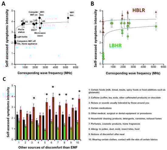 Questionnaire data expressed as self-diagnosed symptoms and discomfort intensities as a function of the wave frequency of EMF sources of interest (A,B) and of sources different from EMF waves (C). Each data is the mean (±standard error of the mean (SEM)) of the values self-assessed by the 26 DEMETER donors (black symbols), by the DEMETER donors of the subset 1 (LBHR) and 2 (HBLR) (green and red symbols, respectively). The logarithmic formulas obtained from data fits were drawn with solid lines ((A): Equation (1); (B): Equations (2) and (3)). In panel (C), the asterisks indicate a significant difference (one-way ANOVA) between subsets 1 and 2 data and mean (p < 0.05).